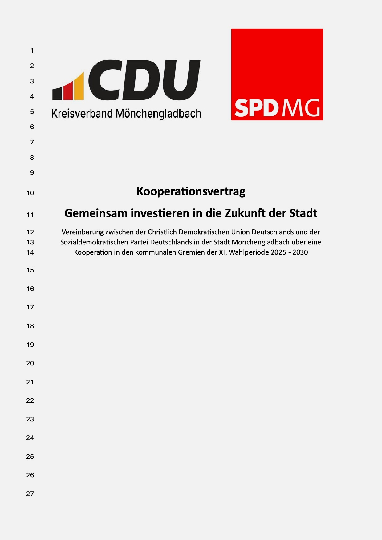 Auf 21 Seiten haben die beiden Parteien in 11 Kapiteln das niedergeschrieben, was ihrer Auffassung nach in den nächsten fünf Jahren in Mönchengladbach geschehen soll.
