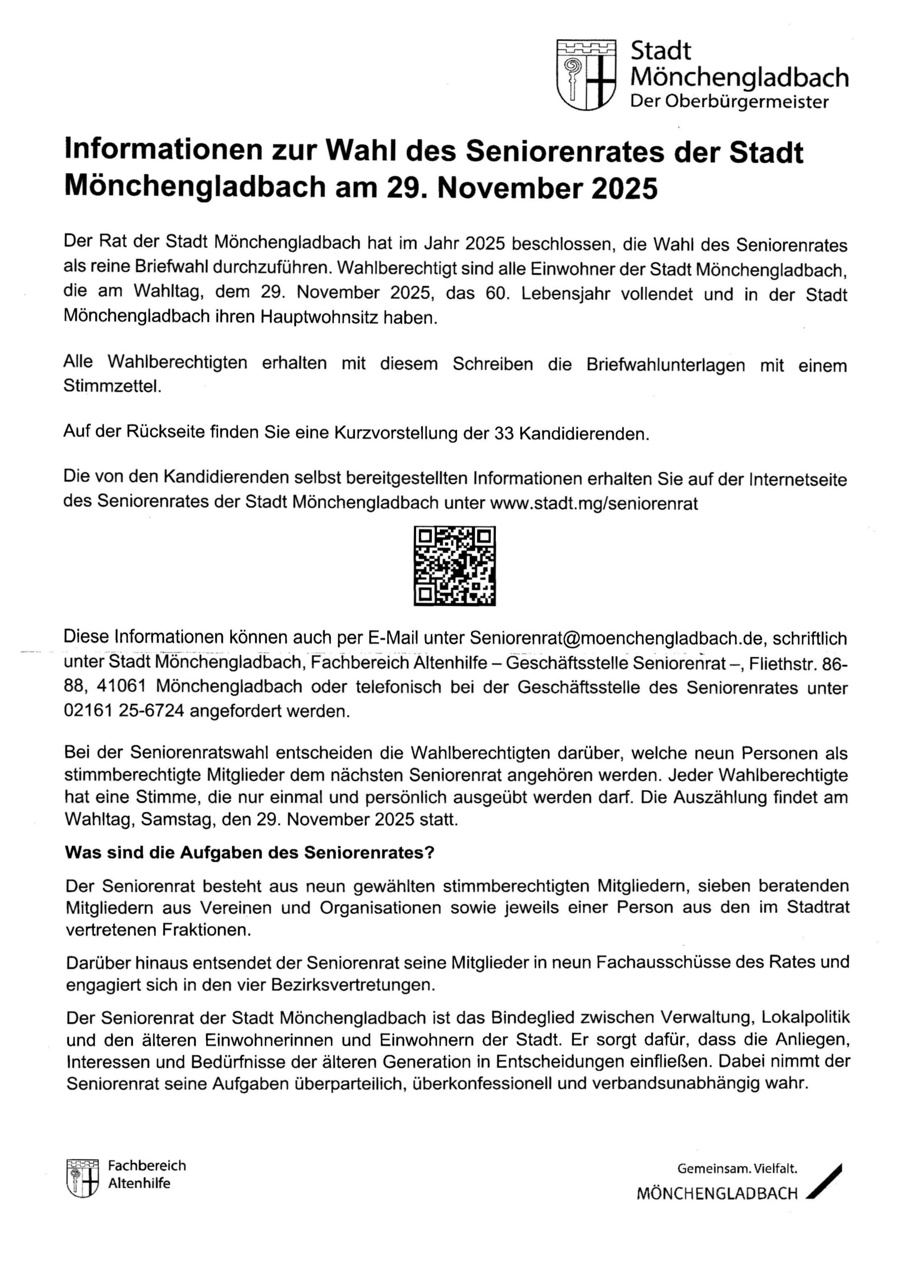 Wenn am 29. November die Auszählung der Wahlergebnisse vom 28.11.2025 zum Seniorenrat beendet ist, wird sich zeigen, wer die neun Senioren sein werden, die sich für die Belange von Mönchengladbacherinnen und Mönchengladbachern jenseits des Alters von 60 engagieren können.
